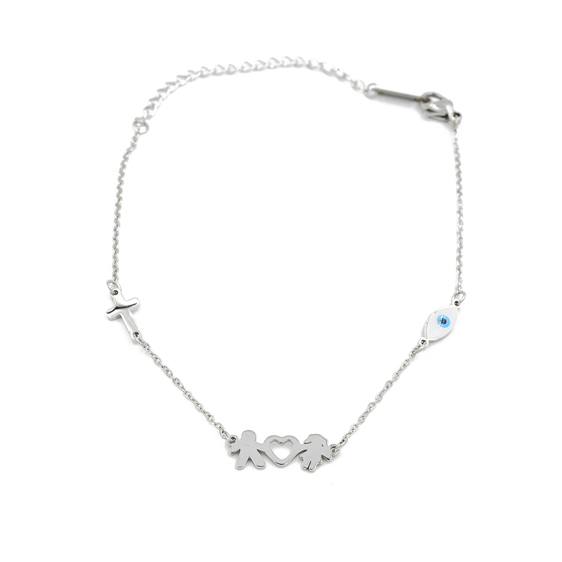 Βραχιόλι απο ατσάλι, σε χρώμα ασημί. Ένα βραχιόλι που σίγουρα θα σας εκφράζει και θα σας δίνει την αίσθηση οτι πάντα θα κουβαλάτε τα παιδάκια σας μαζί σας. Αγόρι και κορίτσι μοιράζονται την καρδιά σας, με ένα σταυρουδάκι και ένα ματάκι!!