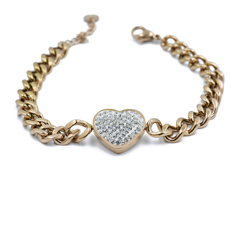 Ένα μοναδικό βραχιόλι, φτιαγμένο για να εντυπωσιάζει κάθε στιγμή. Αλυσίδα σε χρώμα ροζ χρυσό, με μία καρδιά στολισμένη με πέτρες ζιργκόν, απο ατσάλι. Μία επιλογή για δώρο, που θα ξετρελάνει και την πιο απαιτητική γυναίκα